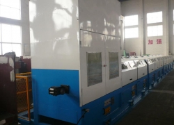 9、拉絲卷筒表面采用R與分級傾斜角設計,適度的R角確保用戶要求的鋼絲具有足夠的推力,使鋼絲拉拔后平滑無跳動上移,分級傾斜角確保鋼絲冷縮時整齊排列,持續與卷筒進行熱交換;卷筒的基體材料為45#,粗加工后熱處理,基體硬度48°,然后卷筒表面噴涂碳化鎢,硬度58°--- 62°,研磨后的卷筒表面光潔度≤0.02mm,光滑的表面確保不擦傷鋼絲,卷筒的水冷系統擁有國家專利(實用新型專利,專利號: ZL 2018 2 0667547.0):卷筒內部采用自除垢系統,冷卻水與卷筒內壁保持5mm間隙,冷卻水環繞卷筒內壁均勻進行熱交換,事實證明此結構效率達80%以上,使用10年以上水路系統免修理,是高效低成本高質量拉拔低碳鋼絲的最佳技術裝備,戶外循環冷卻水池用戶自作,推薦水池尺寸:長3米 × 寬2米 × 深2米 10、主軸軸承采用日本NTN