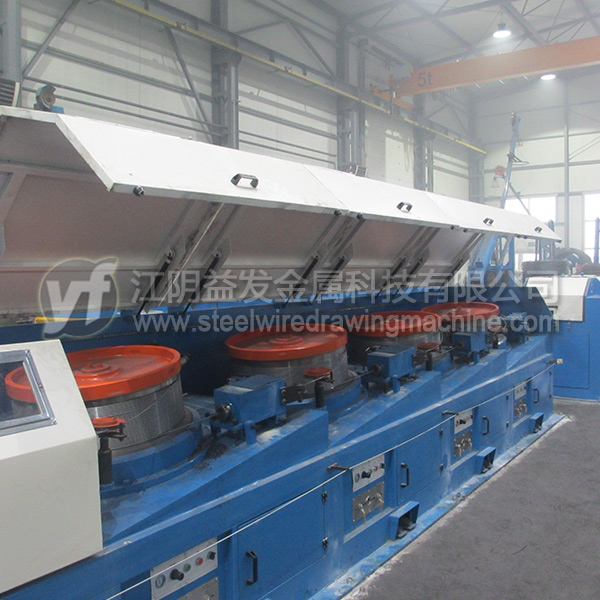 9、拉絲卷筒表面采用R與分級(jí)傾斜角設(shè)計(jì),適度的R角確保用戶要求的鋼絲具有足夠的推力,使鋼絲拉拔后平滑無跳動(dòng)上移,分級(jí)傾斜角確保鋼絲冷縮時(shí)整齊排列,持續(xù)與卷筒進(jìn)行熱交換;卷筒的基體材料為45#,粗加工后熱處理,基體硬度48°,然后卷筒表面噴涂碳化鎢,硬度58°--- 62°,研磨后的卷筒表面光潔度≤0.02mm,光滑的表面確保不擦傷鋼絲,卷筒的水冷系統(tǒng)擁有國家專利(實(shí)用新型專利,專利號(hào): ZL 2018 2 0667547.0):卷筒內(nèi)部采用自除垢系統(tǒng),冷卻水與卷筒內(nèi)壁保持5mm間隙,冷卻水環(huán)繞卷筒內(nèi)壁均勻進(jìn)行熱交換,事實(shí)證明此結(jié)構(gòu)效率達(dá)80%以上,使用10年以上水路系統(tǒng)免修理,是高效低成本高質(zhì)量拉拔低碳鋼絲的*佳技術(shù)裝備,戶外循環(huán)冷卻水池用戶自作,推薦水池尺寸:長3米 × 寬2米 × 深2米