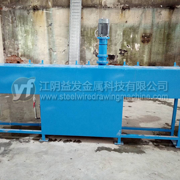 箱體采用Q235板焊接而成,內膽采用314不銹鋼板焊接防止硼砂水受銹蝕的污染,保持硼砂的純潔度,保持鋼絲涂硼效果。兩層之間有40mm的保溫棉。不銹鋼電加熱管12KW,有熱電偶控制溫度,1.5KW的提升泵用于硼砂水上下循環,相當于自動攪拌,箱體上層液體采用了多次溢流方式,出口處高壓氣吹用于調節鋼絲表面的硼砂量。長度2500MM,寬度500mm,高度1100mm,重量800Kg。